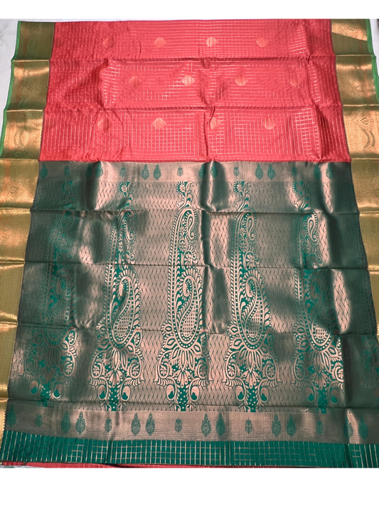 Brick Orange and Green - Kattam - Kanchipuram Silk Saree